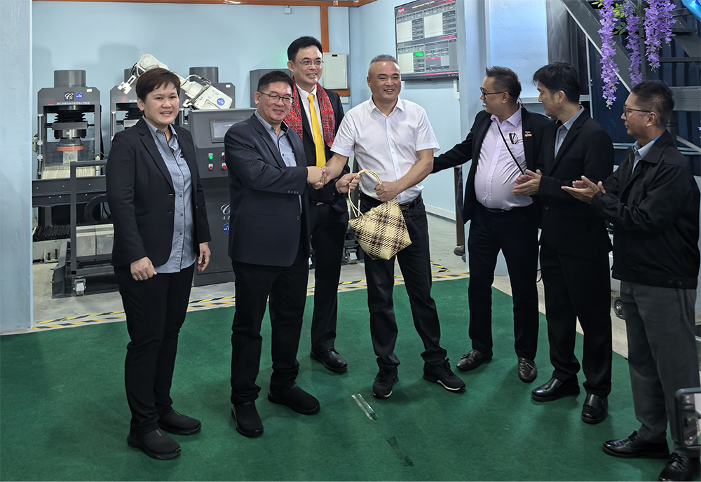 2025年8月26日,我公司董事长阮伟鑫率领高管团队,应邀出席了在马来西亚砂拉越州举行的“马来西亚首台智能混凝土试验机的启动仪式”,现场汇聚了来自砂拉越州政府、工业界、学术界、科研院所等各界领导嘉宾,共同见证这一具有里程碑意义的重要时刻。