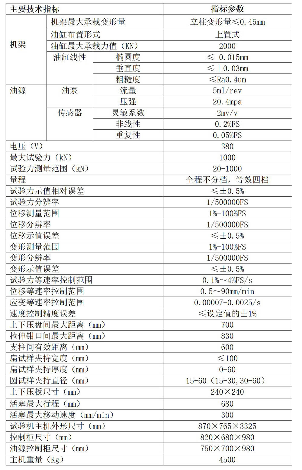 1、本机采用四立柱受力框架,上置双向伺服液压作动器,作动器(活塞)下端连接上平推夹具体,法兰盘式高精度负荷传感器上下分别连接下平推夹具体和底座。